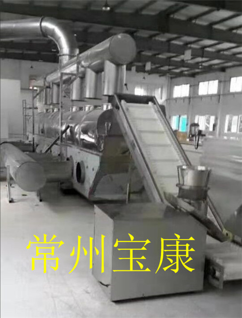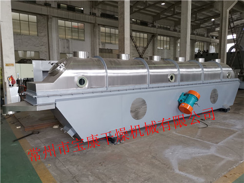 物料自进料进口进入机内,在振动力作用下,物料沿水平面流化床抛掷,向前连续运动,热风向上穿过流化床同湿物料换热后,湿空气经旋风分离器除尘后由排风1:3排出.干燥物料由排料进口排出。