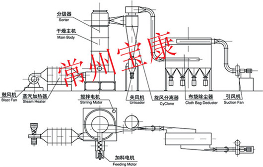物料由螺旋加料器进入干燥器内,在高速旋转搅拌器的强烈作用下,物料受到撞击,摩擦及剪切的作用下得到分散,块状物料迅速粉碎,与热空气充分接触触、受热、干燥。脱水后的干粉料随热气上升,分级环将大颗粒截留,小颗粒从环中心排出干燥器外,由旋风分离器回收,未干透或大块物料受离心力作用甩向壁器,重新落到底部被粉碎干燥。
