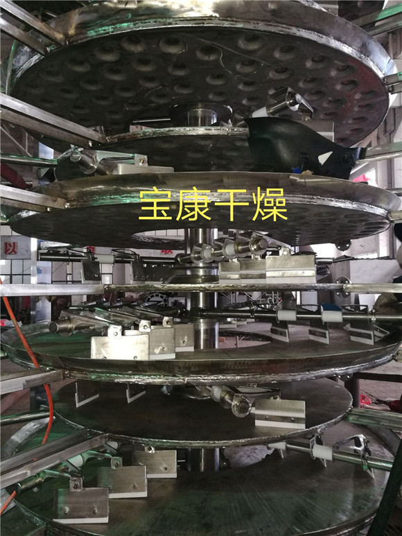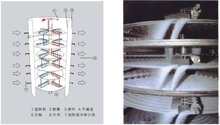 湿物料自加料器连续地加到干燥器上部第一层干燥盘上,带有耙叶的耙臂作回转运动使耙叶连续地翻抄物料。物料沿指数螺旋线流过干燥盘表面,在小干燥盘上的物料被移送到外缘,并在外缘落到下方的大干燥盘外缘,在大干盘上物料向里移动并从中间落料口落入下一层小干燥盘中。大小干燥盘上下交替排列,物料得以连续地流过整个干燥器。中空的干燥盘内通入加热介质(加热介质形式有饱和蒸汽、热水和导热油),加热介质由干燥盘的一端进入,从另一端导出。已干燥物料从^后一层干燥盘落到壳体的底层,^后被耙叶移送到出料口排出。水份由设在顶盖上的排湿口排出。并可通过配加翅片加热器、溶剂回收冷凝器、袋式除尘器、干料返混机构、引风机等辅机,可提高干燥机的生产能力和效果,也能进行热解和反应操作。该设备集传导干燥和搅拌输送之长,结构上采用薄板冲压焊接的大小加热盘和摆动可调的回转耙叶的巧妙组合,配以定量加料和无级调速;工艺上采用串并联输入加热介质和末期冷却降温等措施,料层薄,热阻小,暴露表面大,加热面积100%利用,充分发挥了传导干燥热能利用率高的优点。实践表明,该设备结构新颖紧凑,生产密闭连续,调解维修简便,操作稳定可靠,具有弹性大、效率高、能耗省、干燥时间可控。