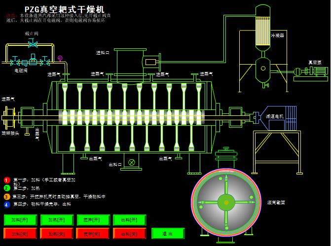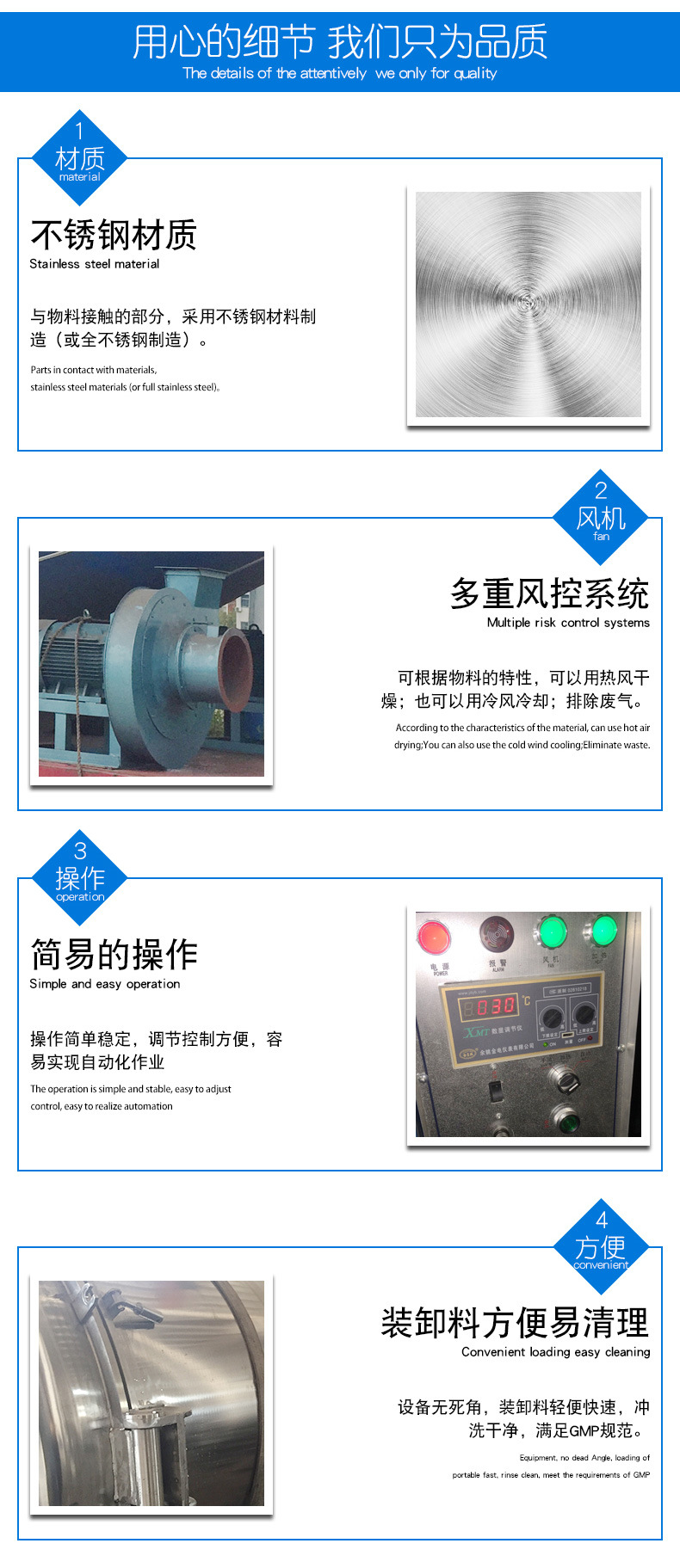 真空耙式干燥机操作简单,进出物料方便,大幅度减轻了工人劳动强度,同时也减少了物料在干燥过程中受到的环境污染,提高了产品质量,符合药品管理规范“GMP”的要求。