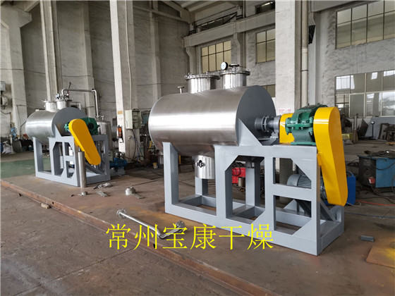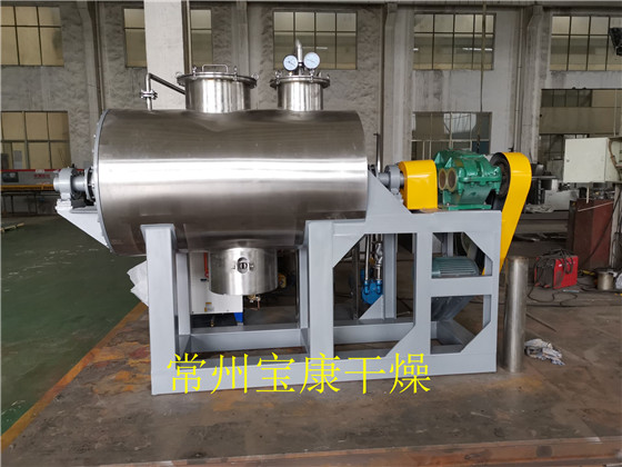 ZB系列真空耙式干燥机是一种新颖卧式间歇式真空干燥设备,湿物料经传导蒸发,带有刮板搅拌器不断清除热面上的物料,并在容器内推移形成循环流,水份蒸发后由真空泵抽出。本机采用大面积夹层加热方式,传热面大,热效率高,设置搅拌,使物料在筒内形成连续循环状态,进一步提高了物料受热的均匀度,从而可顺利进行浆状、膏状、糊状物料干燥。