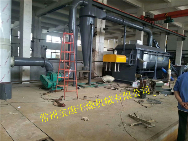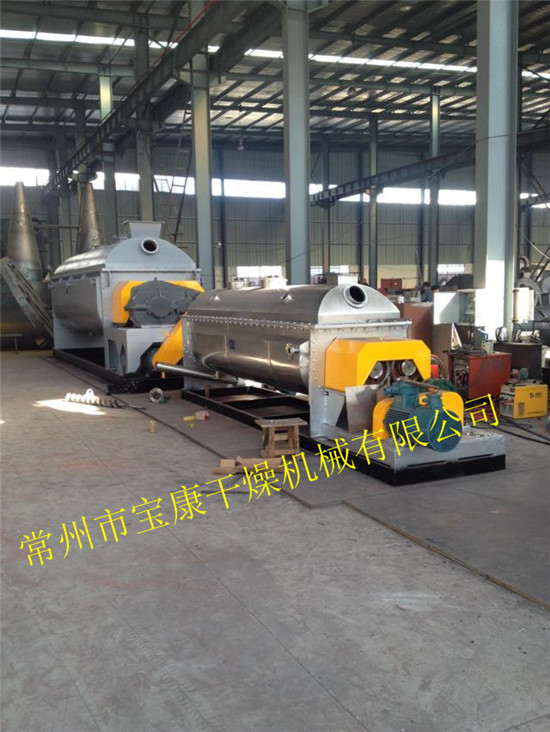 桨叶干燥机已成功地用于化工、石化、染料、工业污泥干化,造纸污泥干化,印染污泥干化,生活污泥干等领域。设备传热、冷却、搅拌的特性使之可以完成以下单元操作:煅烧(低温)、冷却、干燥(溶剂回收)、加热(融化)、反应和灭菌。搅拌 桨叶同时又是传热面,使单位有效容积内传热面积增大,缩短了处理时间。楔型桨叶传热面又具有自清洁功能。压缩--膨胀搅拌功能使物料混和均匀。物料沿轴向成"活塞流"运动,在轴向区间内,物料的温度、湿度、混合度梯度很小。