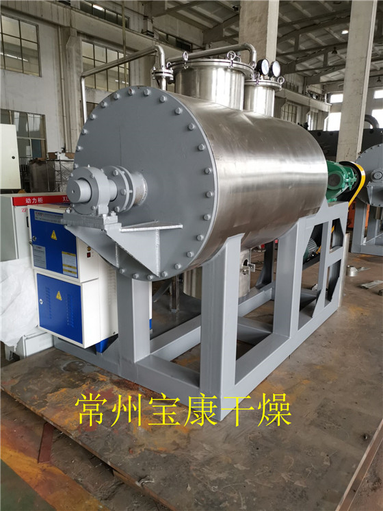 真空耙式干燥机机身中间为圆柱形,器身内外分为三层,中间夹套加热介质可以是导热油循环(压力<0.3mpa表压)或蒸汽(压力<0.3mpa表压),外层用超细玻璃棉,保温效果很好,耗能很少,内层投放物料,特别适用于有被氧化危险的物料和热敏性物料的干燥,在干燥过程中不破坏晶体状的物料,严格限制金属离子的物料以及要求排出挥发物(或有毒物质)须回收(或有毒性)的物料,则更能显示了它的优越性。
