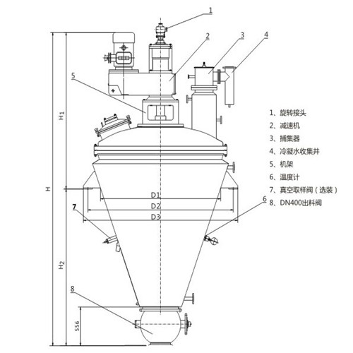 单锥螺带真空干燥机主要由驱动系统、电机减速机、机架、轴承、锥形筒体(带有夹套)、搅拌螺带、取样阀、填料密封等部件组成。设备采用电机减速机与搅拌螺带直连的方式,变频调速,转速0~20rpm,螺带与搅拌轴在特定胎具中进行焊接,使得螺带与桶壁的间隙均匀,确保了运转过程的稳定性;在搅拌轴和封头之间采用柔性石墨填料密封,有效的防止了外界杂质的进入。锥形筒体和椭圆封头都带有夹套,可通入不同种类的热介质并能承受一定压力,在搅拌混合的同时进行加热,实现物料的干燥目的,干燥效果较好,运行稳定。