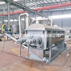 PTA工业污泥的干燥需采用传导加热的低转速搅拌型卧式干燥机。双桨叶干燥机在干燥器筒体上设置夹套,空心轴上设置空心桨叶,在其中通入热载体(水蒸汽、导热油),湿物料在搅拌桨叶的搅动下筒体及桨叶热表面进行充分热交换,以达到干燥的目的。